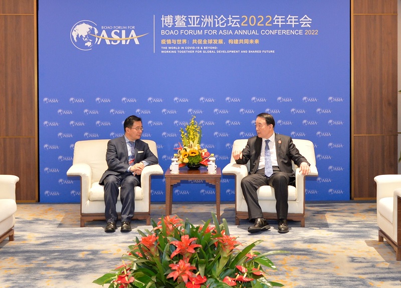 4月21日下午,博鳌亚洲论坛秘书长李保东在琼海博鳌亚洲论坛大酒店会见了中国南海研究院院长王胜,双方就未来博鳌亚洲论坛秘书处与中国南海研究院进一步強化合作的领域和事项进行了深入交谈。