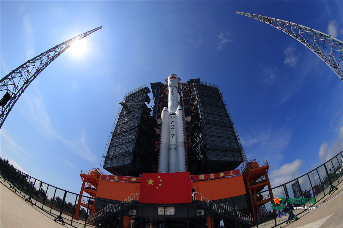 天舟一号货运飞船在长征七号火箭的顶端待发