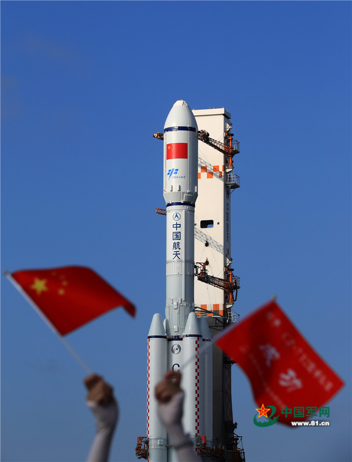工作人员挥舞国旗为天舟一号货运飞船加油