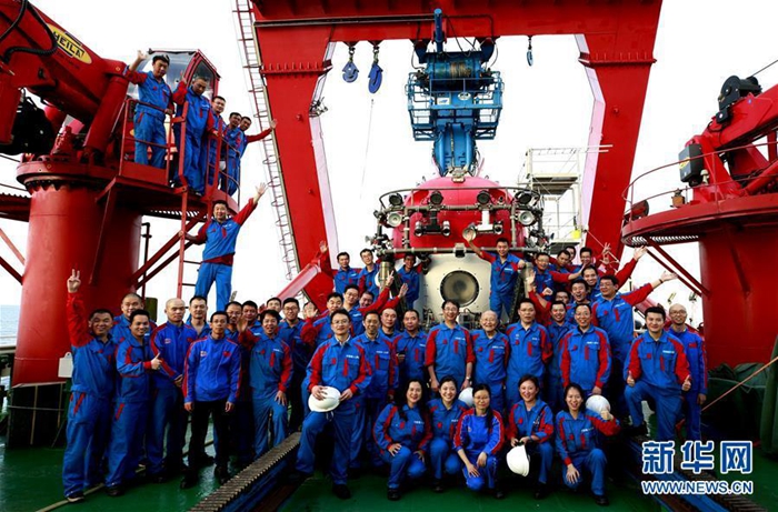 5月24日,我国“南海深部计划”西沙深潜航次圆满结束,来自全国14个单位60名考察队员乘坐“探索一号”科考船返回三亚。在本航次中,我国科学家乘坐“深海勇士”号载人深潜器在南海首次发现“冷水珊瑚林”和新的冷泉活动喷口。图为5月23日,“南海深部计划”西沙深潜航次的部分考察队员在“深海勇士”号前合影。