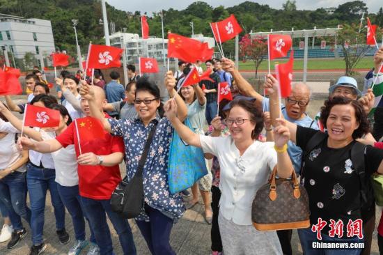 4月30日,香港市民挥舞中华人民共和国国旗和香港特区区旗,欢迎海军舰艇编队到来。当日,由导弹驱逐舰海口舰、导弹护卫舰黄山舰组成中国人民解放军海军舰艇编队,在执行完海军成立70周年阅舰任务返航归建途中靠泊香港,受到香港特区政府和市民热烈欢迎。中新社记者 谢光磊 摄