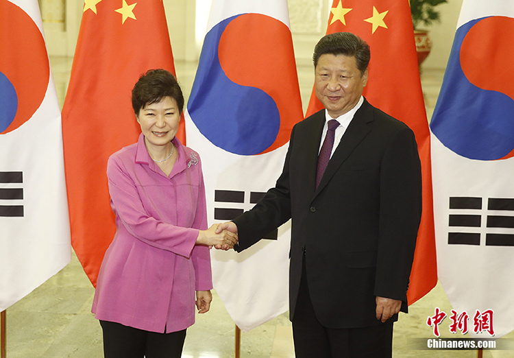 习近平欢迎朴槿惠来华出席中国人民抗日战争暨世界反法西斯战争胜利70周年纪念活动。习近平强调,中韩是友好近邻,是促进地区和世界和平的重要力量。两国人民在反抗日本殖民侵略和赢得民族解放的斗争中团结互助,为世界反法西斯战争胜利作出了重要贡献。