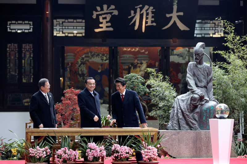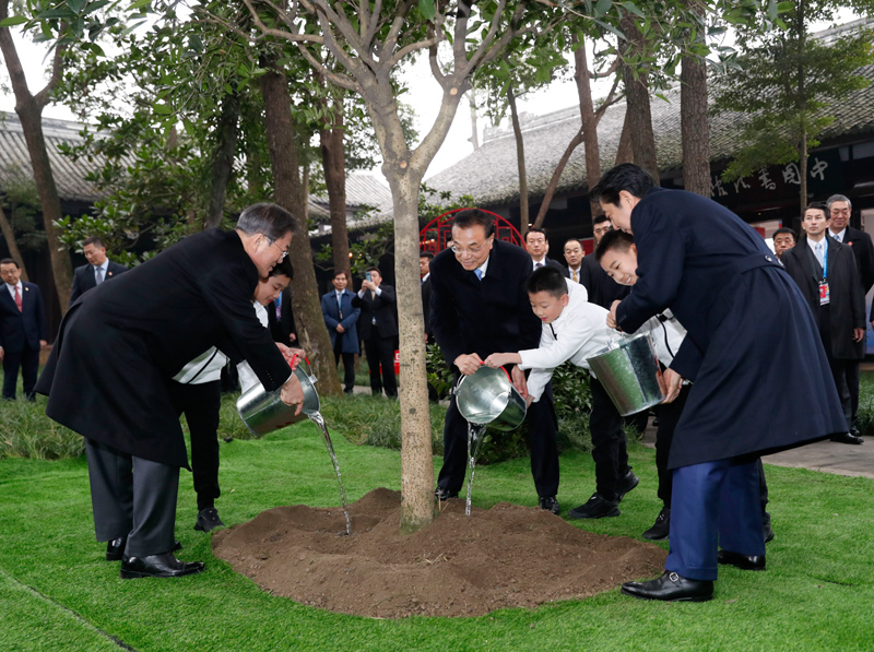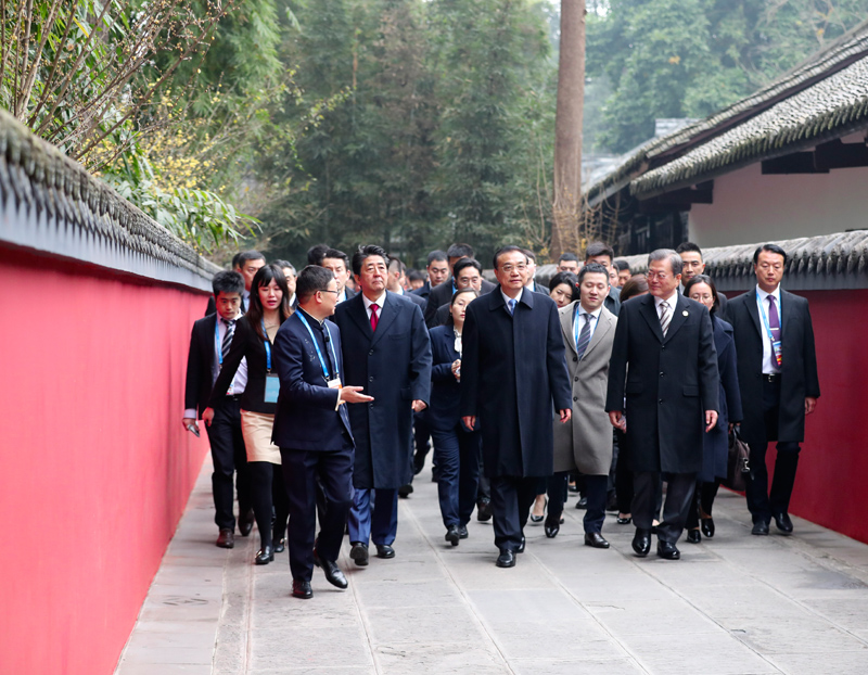 国务院总理李克强12月24日下午在四川成都杜甫草堂博物馆与韩国总统文在寅、日本首相安倍晋三共同出席中日韩合作20周年纪念活动。