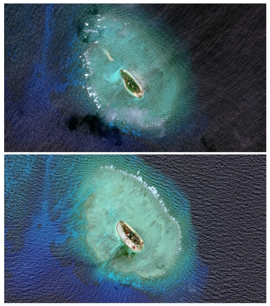 新华国际客户端了解到,这些卫星照片拍摄于2010年至今年4月30日间。美国智库战略与国际问题研究中心研究照片发现,越南在所占的敦谦沙洲和西礁上填海造地,并修建设施。