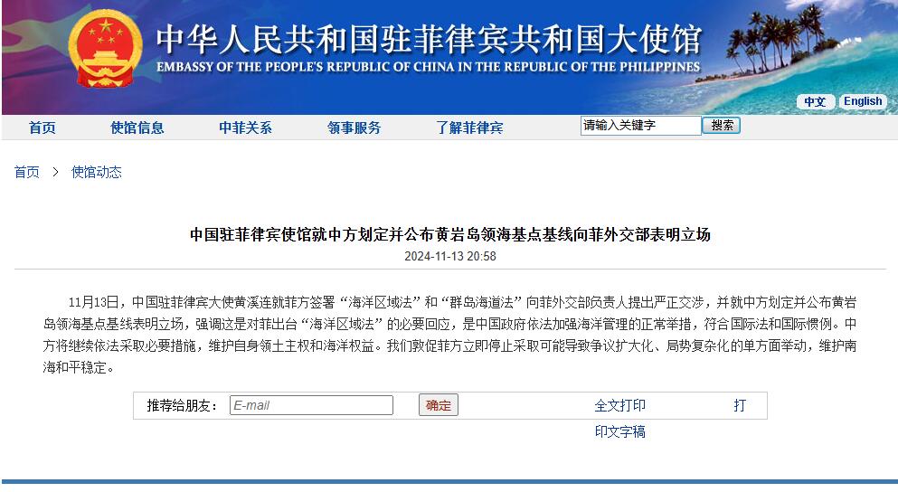 据中国驻菲律宾大使馆网站,驻菲使馆就中方划定并公布黄岩岛领海基点基线向菲外交部表明立场: