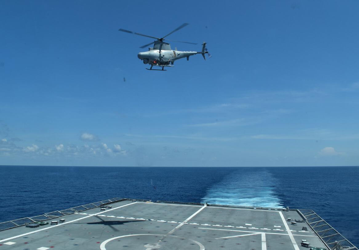 “蒙哥马利”号濒海战斗舰在南海出动舰载无人直升机训练