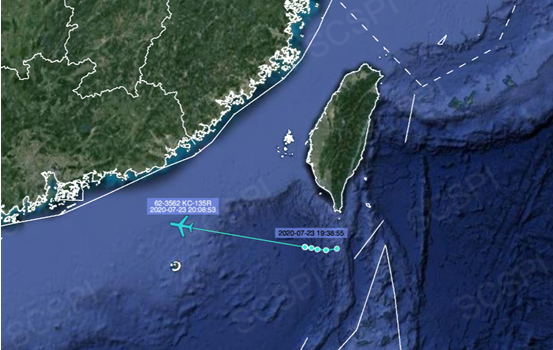 据“南海战略态势感知计划”平台7月23日发布的消息,当天早些时候一架美军海军P-3C反潜巡逻机从台湾南部海域进入南海,向西飞行一段距离后折返;当天夜间8点至9点,美国空军的一架RC-135W侦察机和一架P-8A反潜巡逻机从台湾南部海域进入南海,向着广东省方向向西飞行;当天还有四架美国空军KC-135R空中加油机出现在西太平洋海域,其中两架进入南海上空。