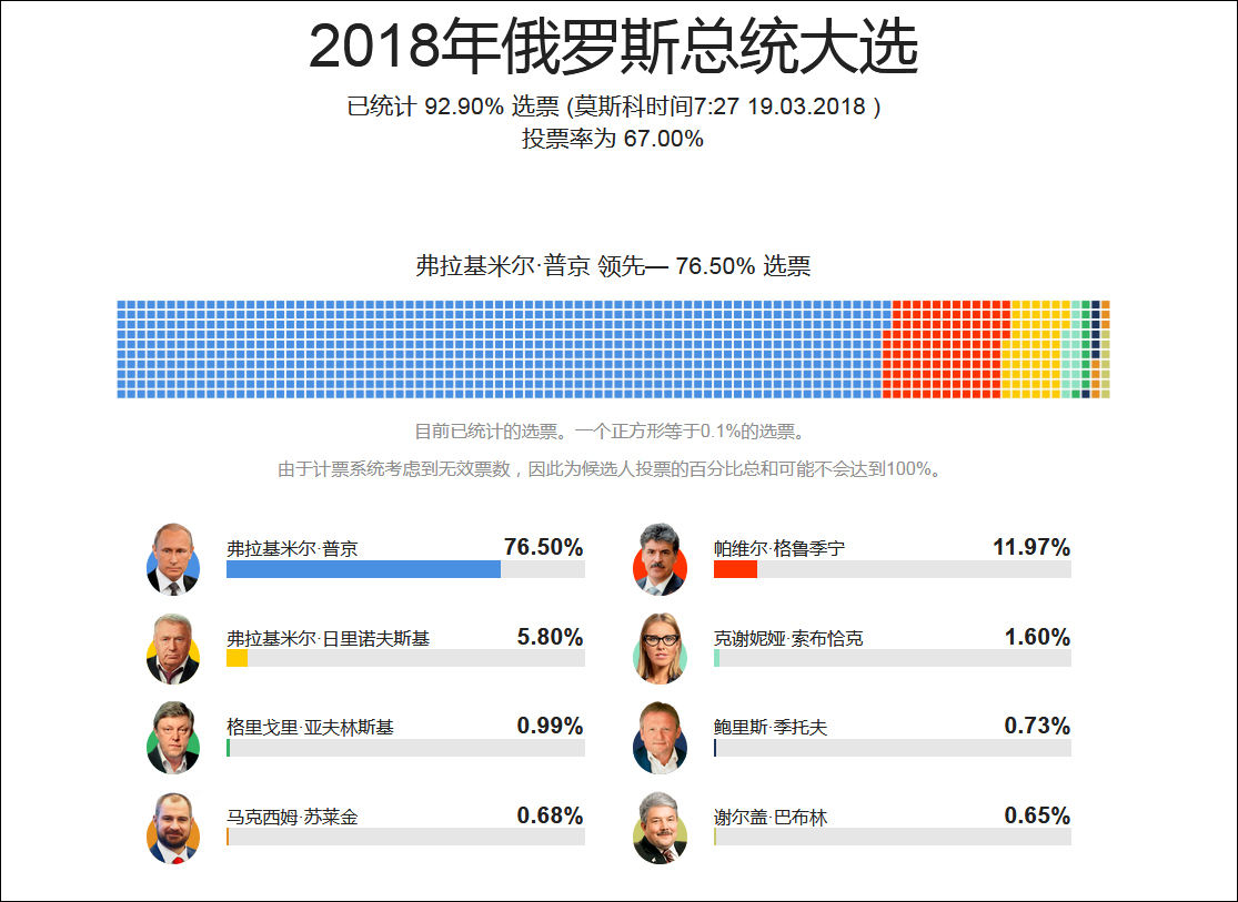 截至发稿,俄罗斯总统选举已经完成92.9%的选票统计工作,其中现任总统普京得票率为76.50%。目前的投票率为67%。