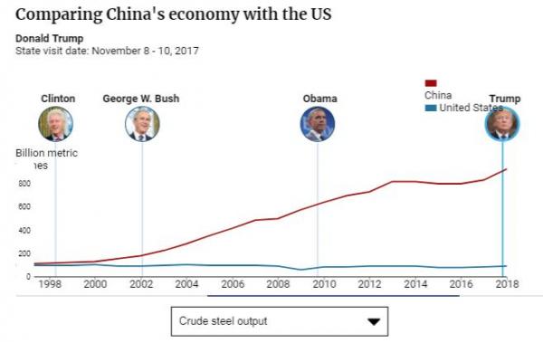 从克林顿到特朗普,中美粗钢产量对比
