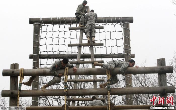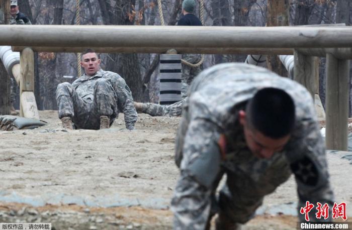 资料图:韩国东豆川美国陆军基地内,美军士兵进行军事技能训练。