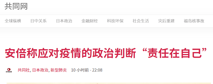 据日本共同社4月9日报道,安倍7日在记者会上曾就遏制疫情扩散失败一事表示,“这并非是由我承担责任就行的事情。”但在9日的书面回应中,安倍改口称,“政治判断的责任在我自己。”