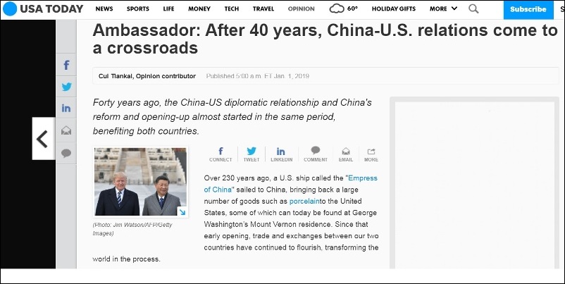 据中国驻美利坚合众国大使馆网站1月2日消息,当地时间1月1日,在中美建交四十周年到来之际,中国驻美大使崔天凯在《今日美国报》以“发展面向未来的中美关系,维护两国人民的共同利益”为题发表署名文章。文章表示,在新的国际形势下,中美关系又一次站在了历史的十字路口。两国人民对中美关系的发展寄予厚望,期望从中更多获益,他们的共同利益必将超越“政治正确”,超越两国之间的某些分歧。展望未来40年,中美关系应继续由两国人民来定义。