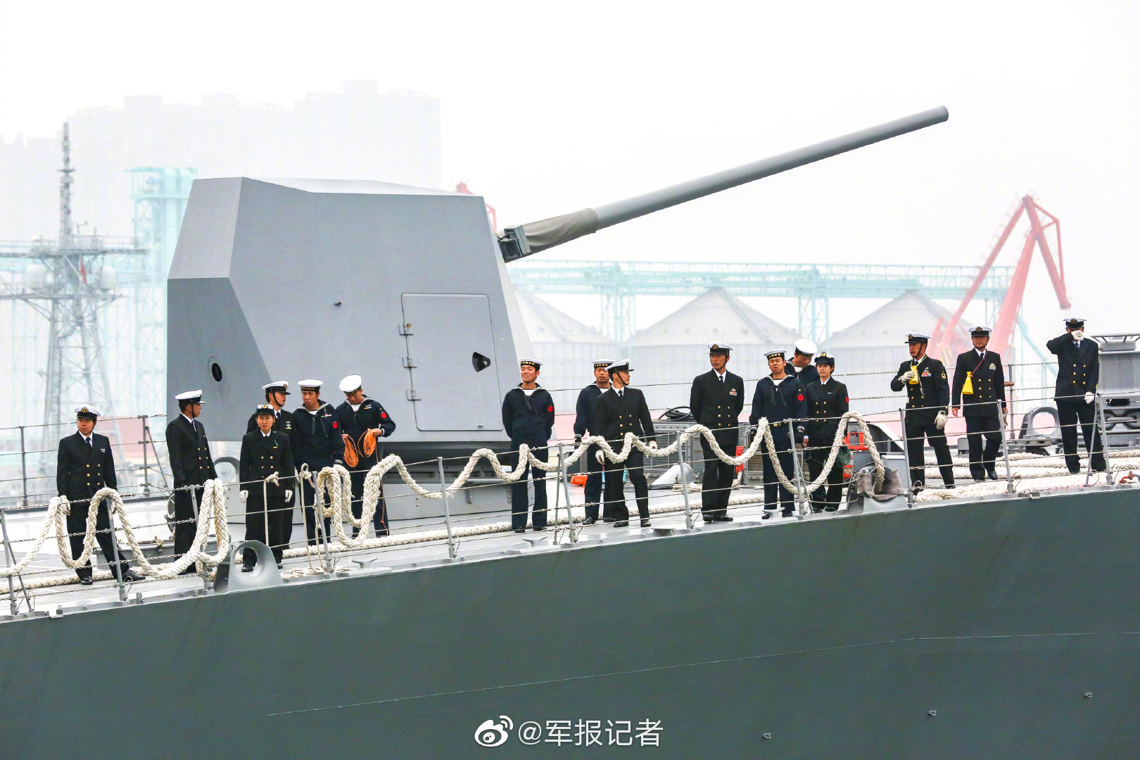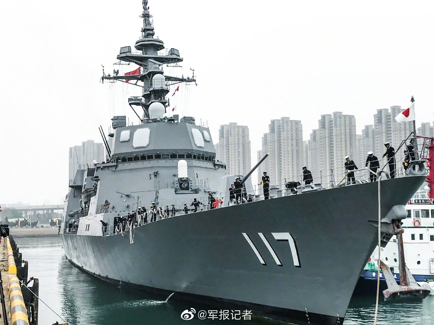 据@军报记者 4月21日消息, 4月21日上午,日本海上自卫队秋月级驱逐舰“凉月号”(JS Suzutsuki DD-117)抵达青岛大港码头,参加中国海军成立70周年多国海军活动。这是海上自卫队舰艇自2011年12月以来时隔7年多再次访华。“凉月”号装备有源相控阵雷达和改进型海麻雀导弹,是日本海上自卫队较新锐的一艘战舰。