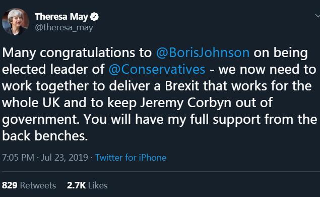 特蕾莎·梅第一时间在社交媒体上发表祝贺,她称现在英国需要团结,鲍里斯在“脱欧”问题上将得到她的全力支持。特蕾莎·梅本人于23日出席最后一次国会问答环节,之后会回到首相府收拾物品。今天(24日),特蕾莎·梅将前往白金汉宫正式向英女王提交辞呈。
