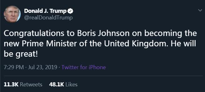 特朗普也于23日晚间在社交媒体上向鲍里斯发来贺电,内容很简短:“恭喜鲍里斯接手英国首相一职,他将会很棒!”