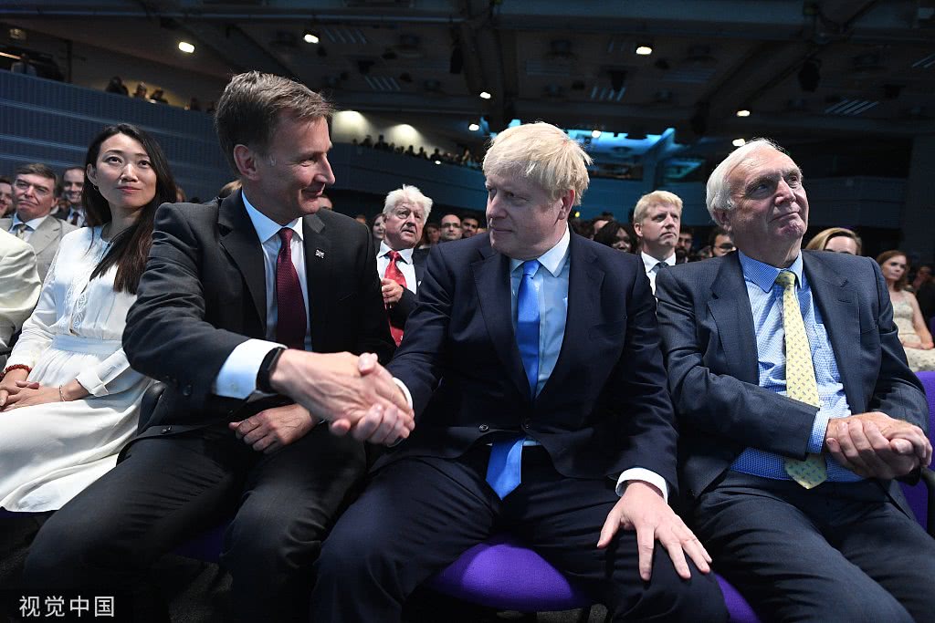 当地时间2019年7月23日,英国伦敦,英国保守党新党魁人选在伦敦的伊丽莎白二世女王会议中心揭晓,前外交大臣鲍里斯·约翰逊胜选,现任外交大臣亨特表示祝贺 @视觉中国