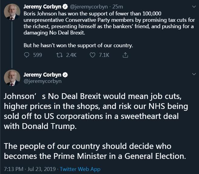 在野党工党党魁科尔宾则选择“泼冷水”,他指出,鲍里斯虽然赢得保守党的支持,“但并没有赢得全国民众的支持”。他继而批评鲍里斯的“无协议脱欧”,讽刺道他会和美国总统特朗普达成“甜蜜的协议”,届时英国国民医保体系会被外包给美国企业。