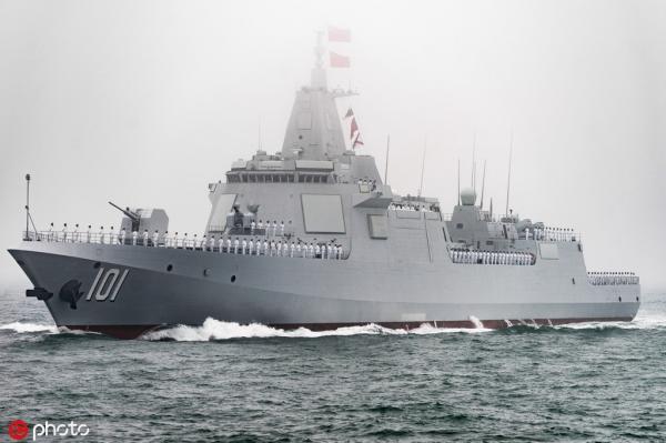 2019年4月23日,山东青岛,中国人民海军“万吨大驱”101号导弹驱逐舰南昌舰亮相阅舰式。图片来源:IC Photo