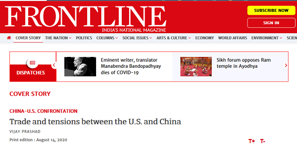 印度《前线》杂志发表印度学者文章评论当下的中美紧张关系 图片来源:网站截图